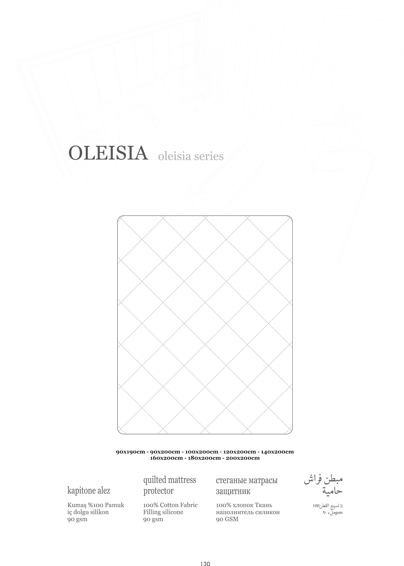 Протектор за матрак от серията Oleisia, създаден за комфорт и надеждна защита в ежедневието. Капитонираната структура осигурява равномерно разпределение на пълнежа от силиконови влакна и допълнителна мекота. С плътност 90 gsm, протекторът е лек, дишащ и подходящ за целогодишна употреба. Изработен от 100% памучен плат, той е нежен към кожата и осигурява комфорт по време на сън. Предлага се в различни размери и е в класически бял цвят.